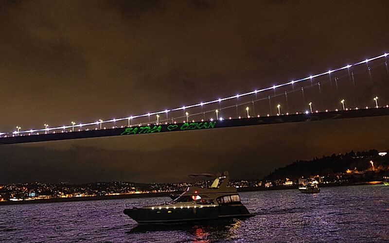Boğaz köprüsü altında lazer ışıklı yazıyla doğum günü tebriği.