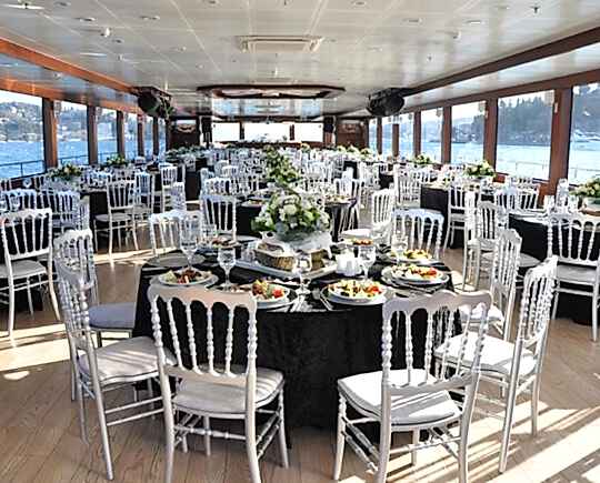 Teknede düğün davetinde Maks. 400 kişiye kadar hizmet veriyoruz. Teknede düğün organizasyonları 4 saat sürmekte. Rezervasyon saatleri müşteri tarafından belirleniyor. Davet teknelerimiz düğün, nişan, kına gecesi, nikah sonrası eğlence organizasyonu süresince 3 Köprü arasında Asya, Avrupa yakası kıyılarında seyir halinde olacağız. Teknelerimizin tümünde profesyonel müzik sistemi mevcut. Davet teknelerimiz 3 katlı olup tüm alanlar misafirlere açıktır. Teknede düğün organizasyonu yemekli, yemeksiz tercih yapılabilir. Müşteri isterse ikramları dışarıdan kendisi karşılayabilir. Yemek menüleri teknelerimizde aşçılarımız tarafından hazırlanıp masaya sıcak servis sağlıyoruz. Teknede düğün davetinde; Girişte tül süslemeler, Kapalı salonda masa düzeni, Masalarda beyaz masa örtüsü, Şamdan veya Çiçek aranjman. Açık alanlarda loca oturma düzeni, Ortalarda giydirilmiş bistro masalar hizmetimize dahil edilmiştir.