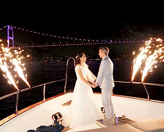 Teknede düğün davetine özel hizmetimiz Damat ve Gelinin düğün yapılacak tekneye transferini gerçekleştiriyoruz. Davetlilerin gelmesiyle birlikte iskeleden ayrılan düğün teknemiz Boğaz köprüsü altında demirliyor. Damat ve Gelin farklı iskeleden özel yatlarımız ile alınarak Boğaz köprüsü altında bekleyen düğün teknesi çevresinde dönüş yaparak katılımcılar selamlanıp Damat ve Gelinin düğün yapılacak teknemize geçişi sağlanır. Gelin ve Damat yat transfer fiyatları için bizimle iletişime geçiniz.